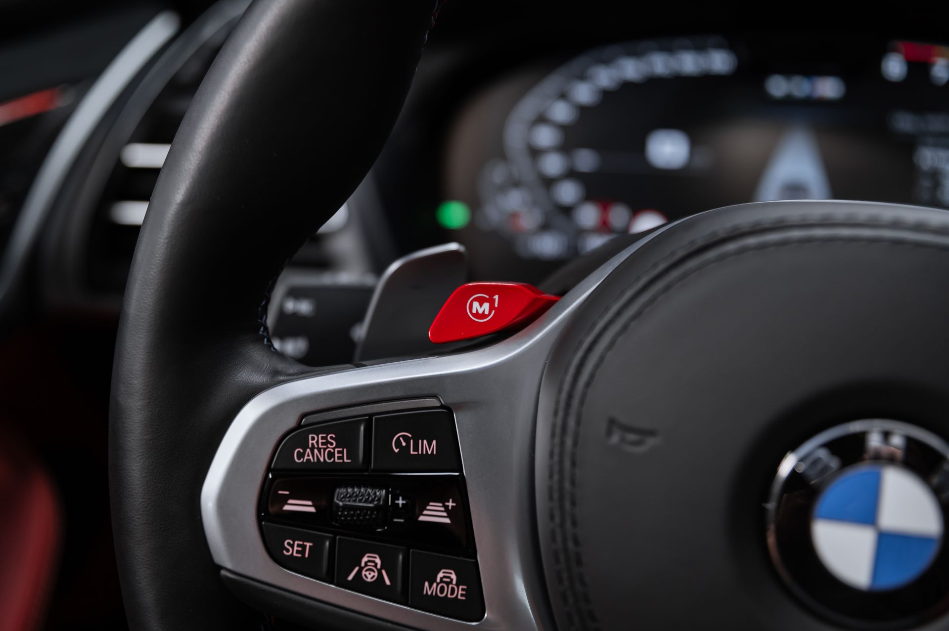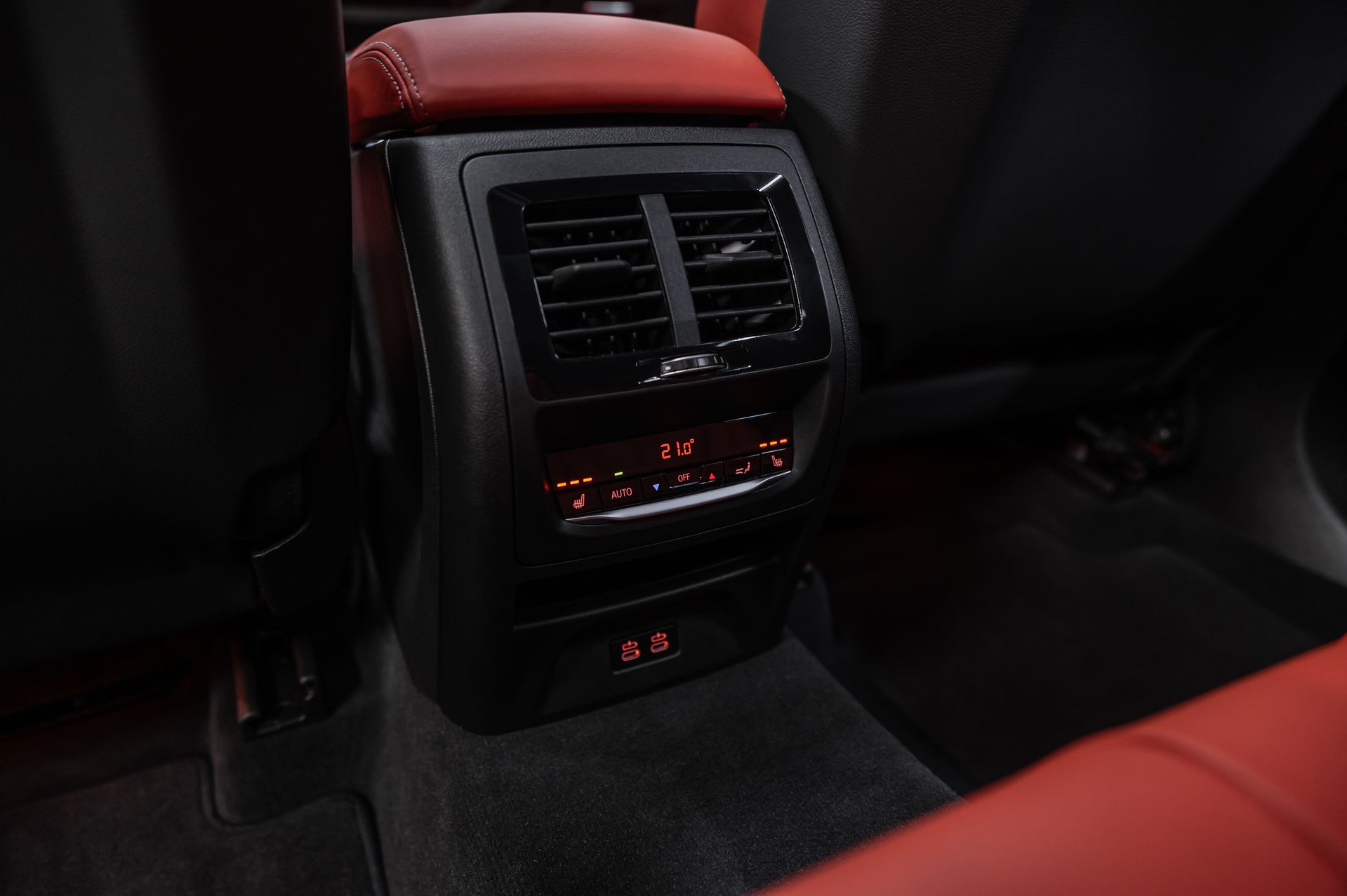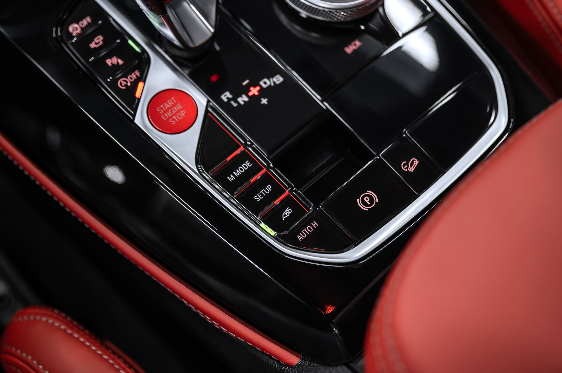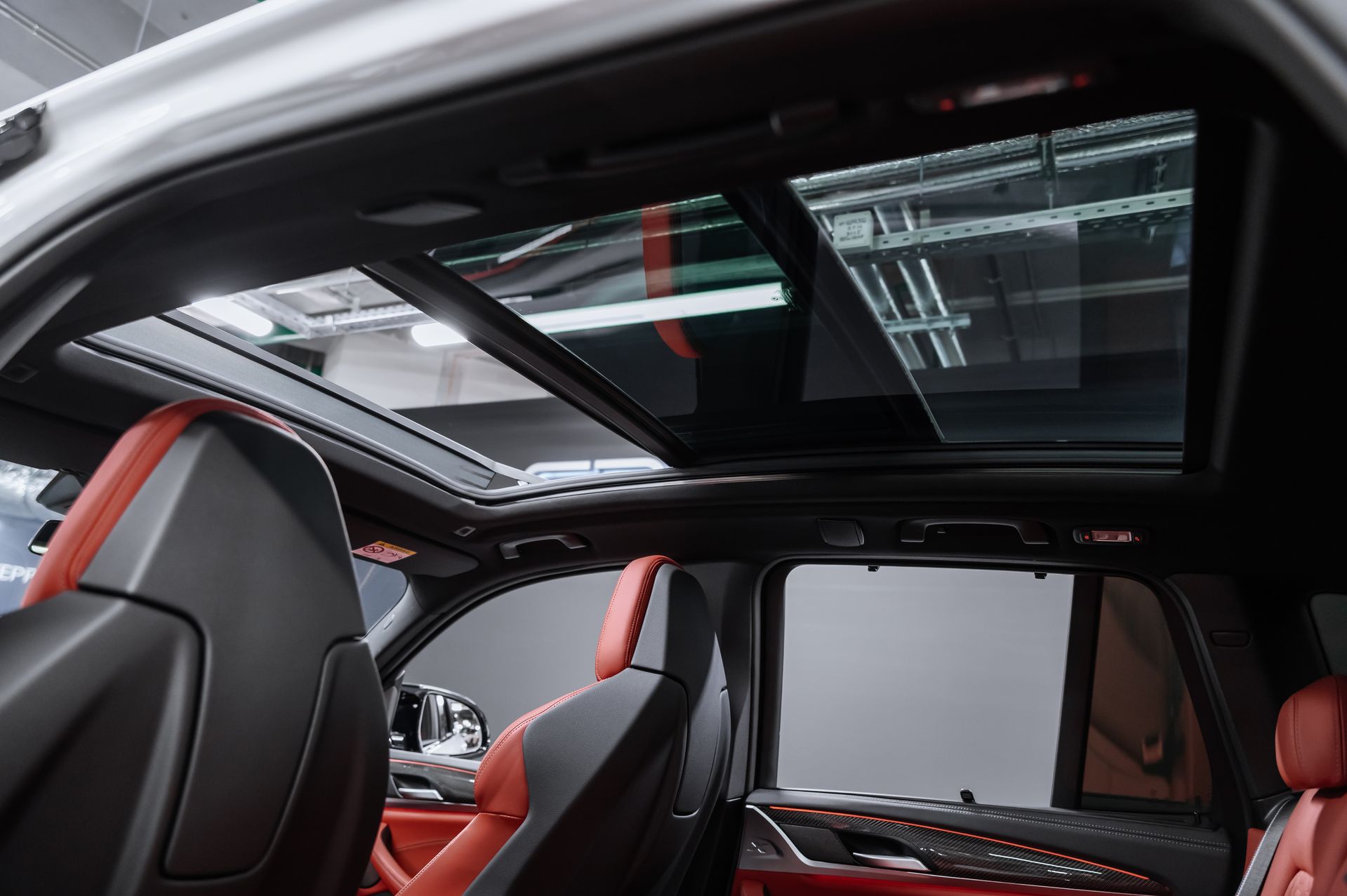 Салон BMW X3 M выполнен в эффектной красной коже с контрастными вставками и спортивной архитектурой. Водителя встречает многофункциональное M-рулевое колесо с кнопками M1/M2 для быстрого вызова индивидуальных настроек, цифровая приборная панель и крупный центральный экран мультимедийной системы. Карбоновые вставки и продуманная эргономика подчёркивают спортхарактер модели.