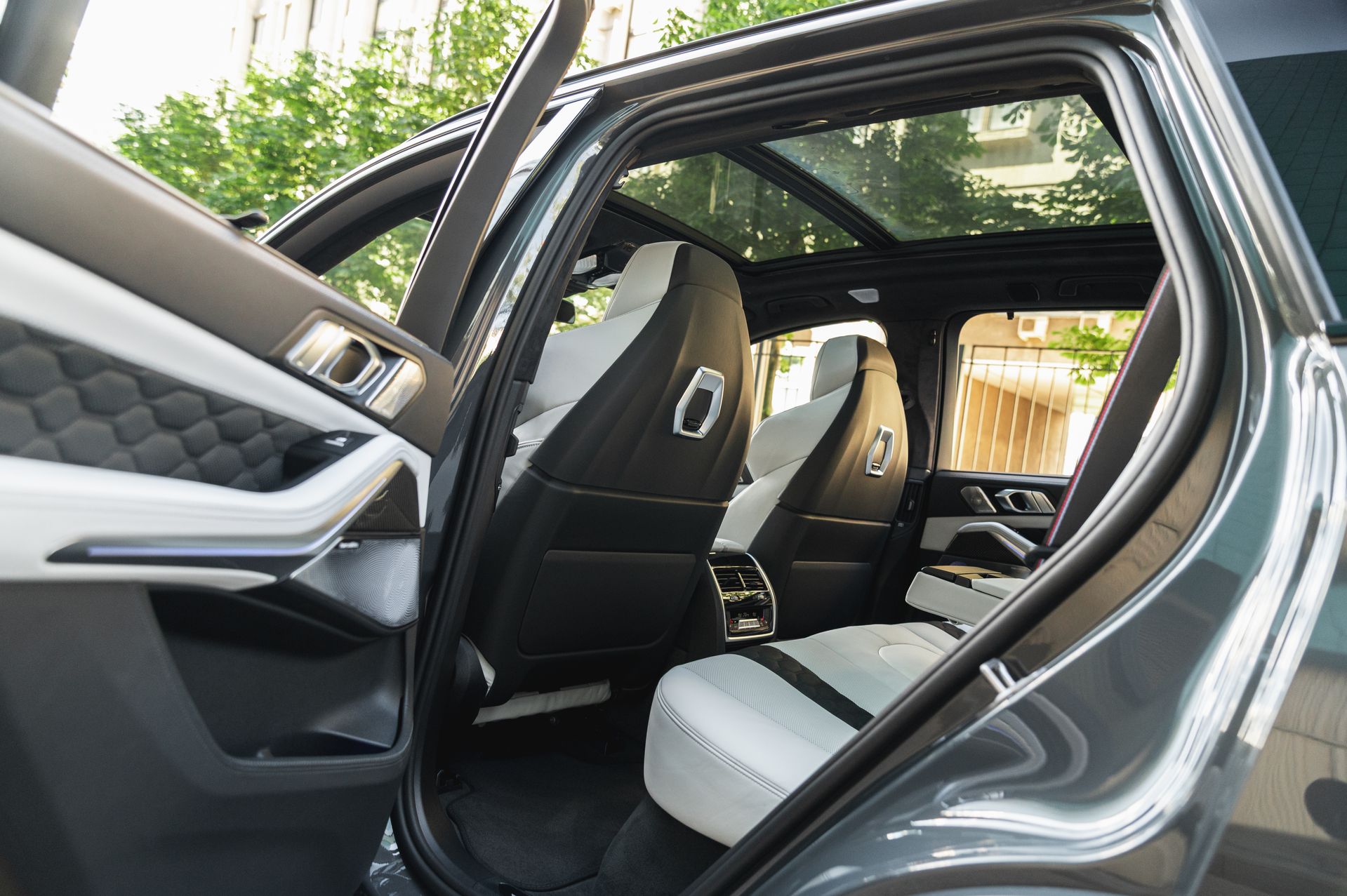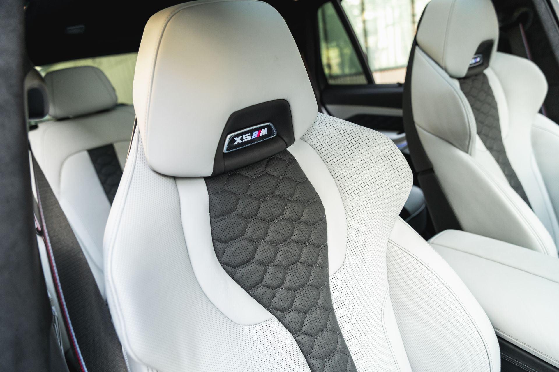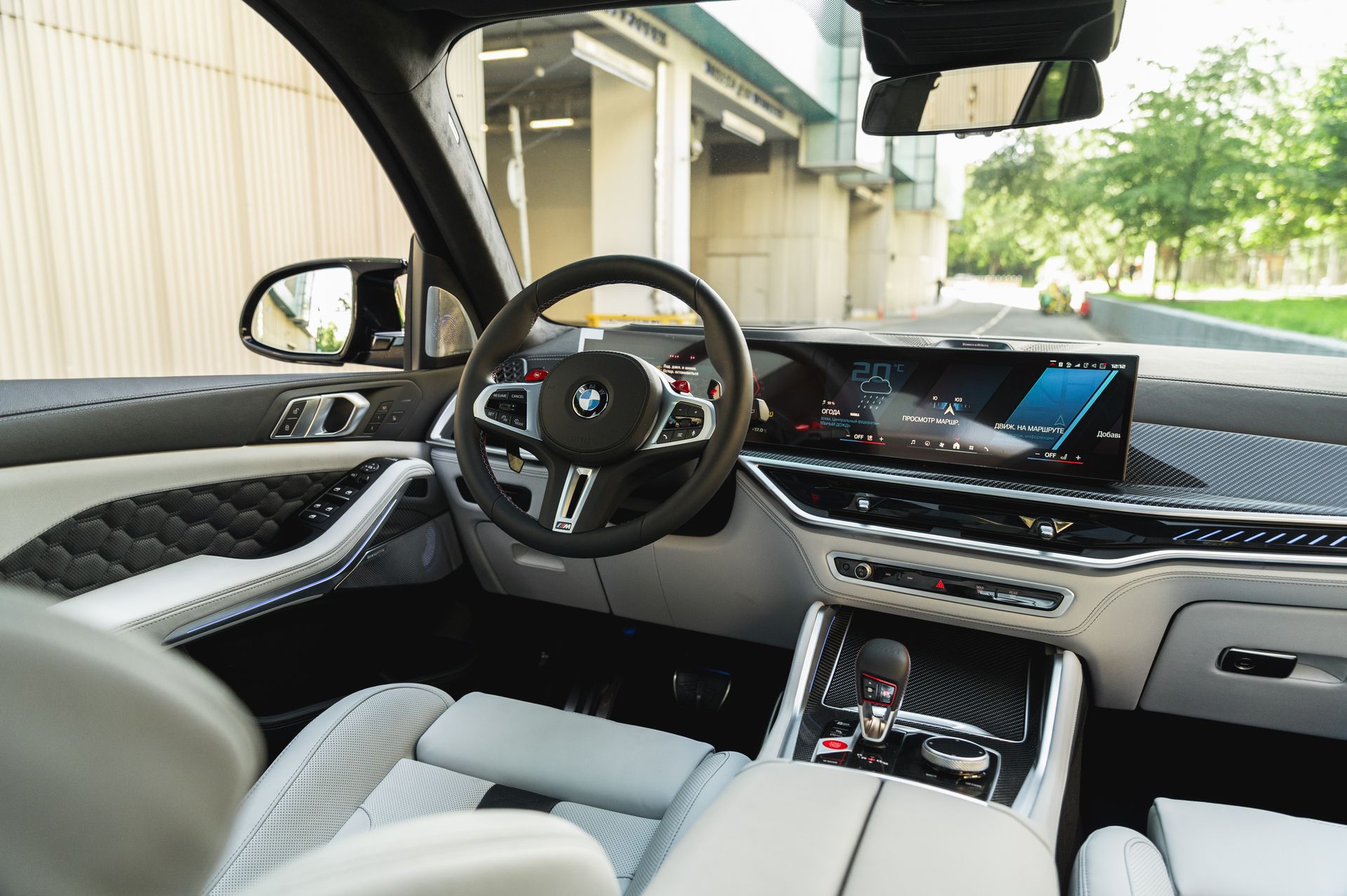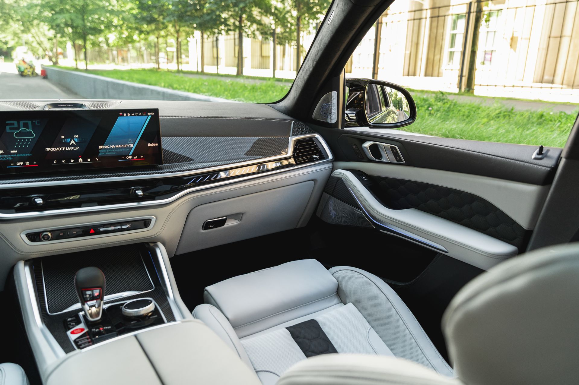 Внутри — многофункциональные сиденья M с выраженной боковой поддержкой, интегрированными подголовниками и подсвеченной эмблемой «X5M». Они надёжно фиксируют тело в поворотах и при этом остаются комфортными в длительных поездках.