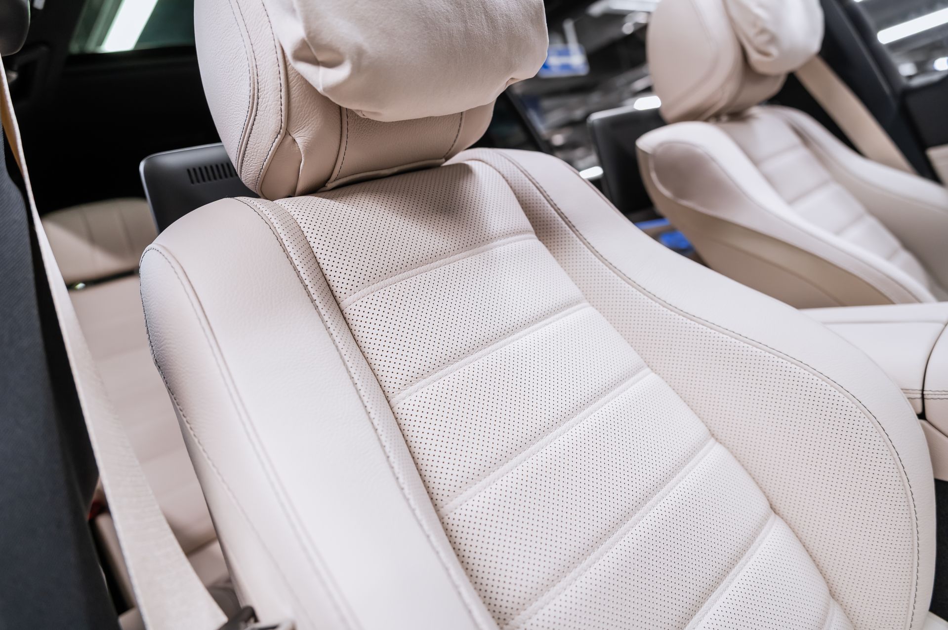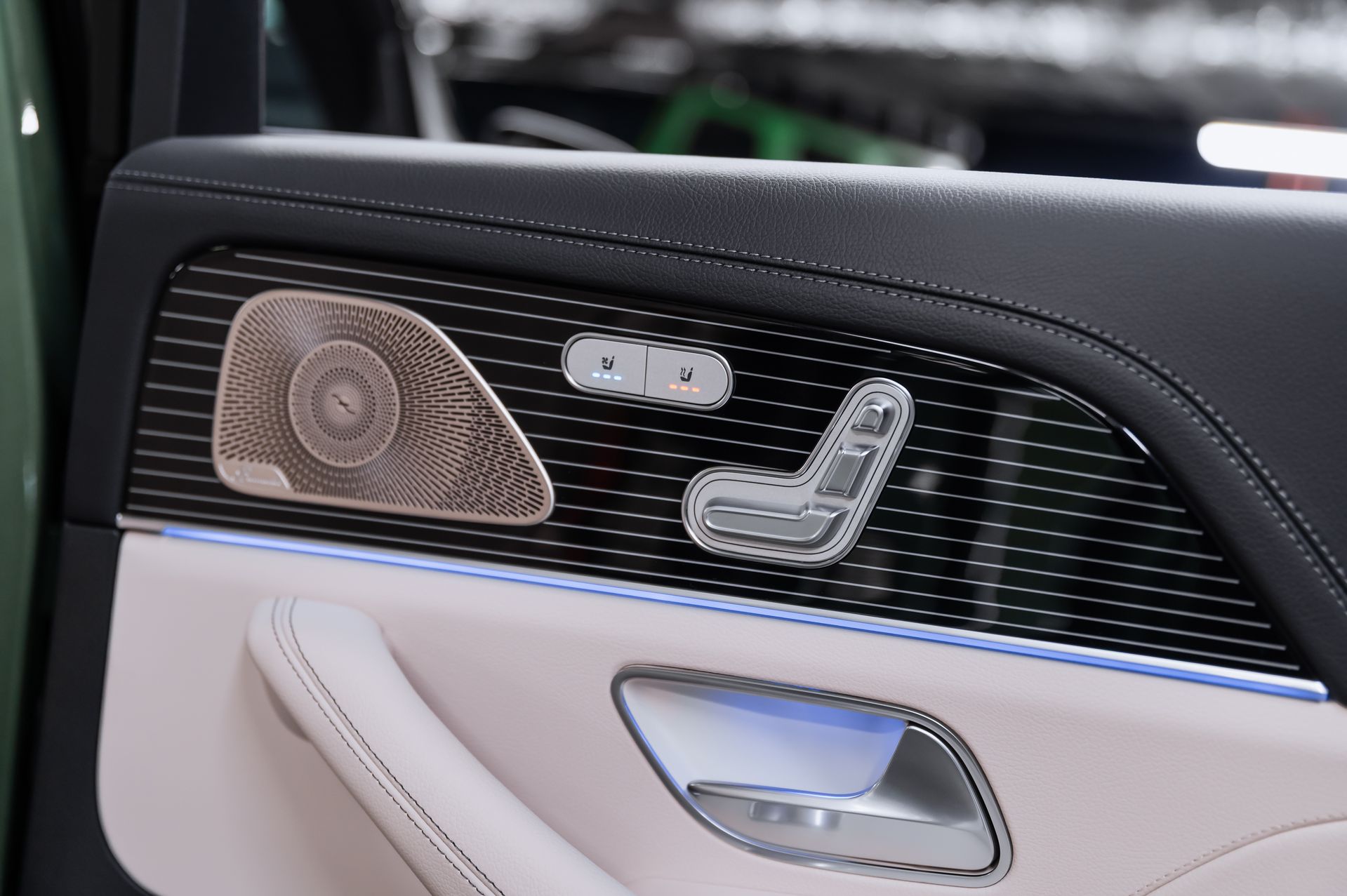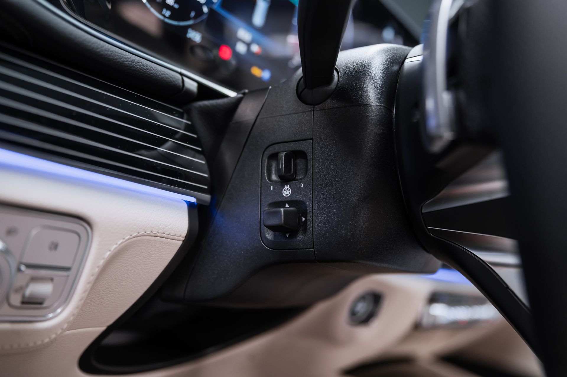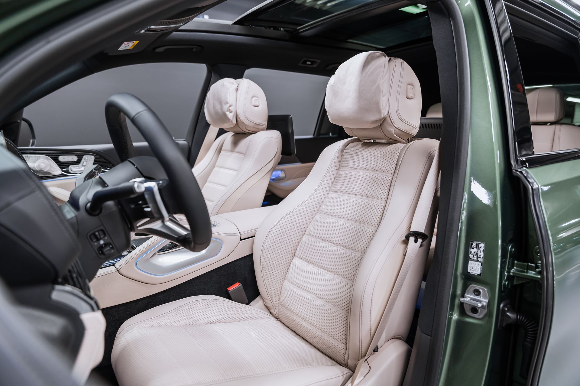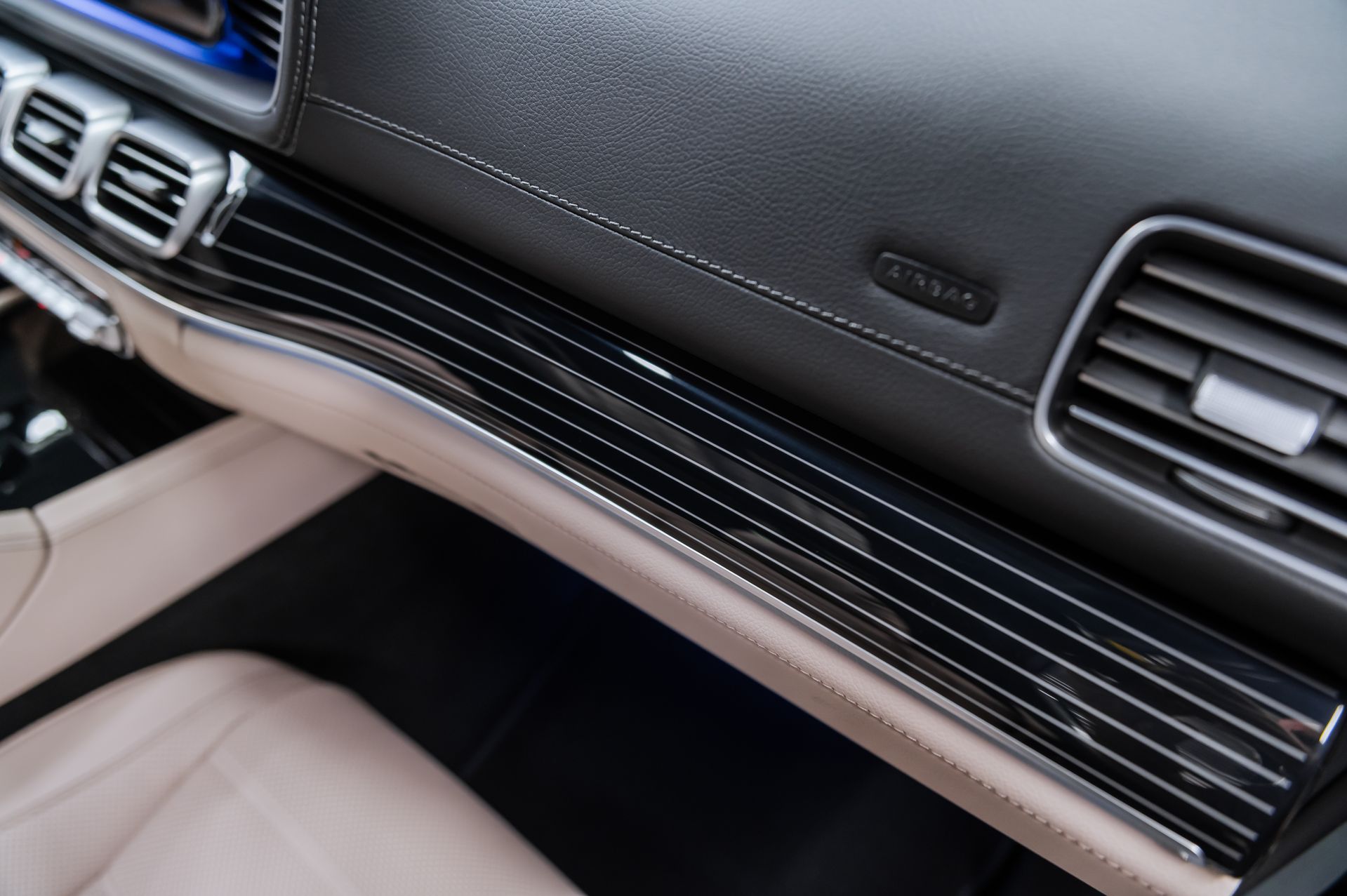 Салон Mercedes-Benz GLS 450 d 4MATIC выполнен в светлой коже с аккуратной прострочкой и контрастными вставками. Водителя встречает многофункциональный кожаный руль, широкий центральный тоннель с удобной органной клавиатурой и два объединённых экрана MBUX с высоким разрешением. Все элементы эргономики продуманы для длительных поездок: широкий подлокотник, множество ниш и подстаканников, продуманная организация управления климатом и сиденьями.
