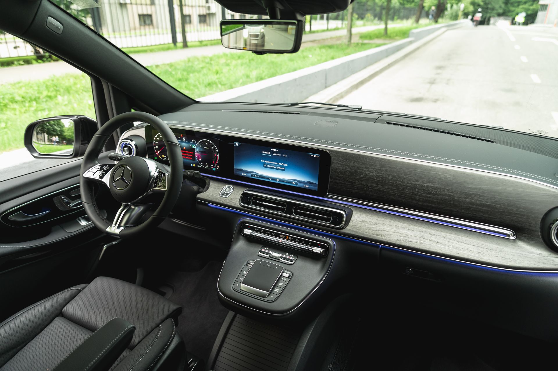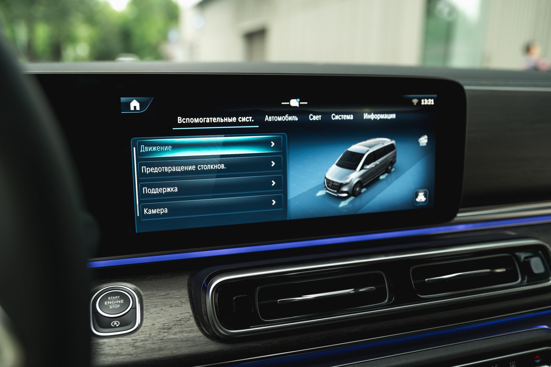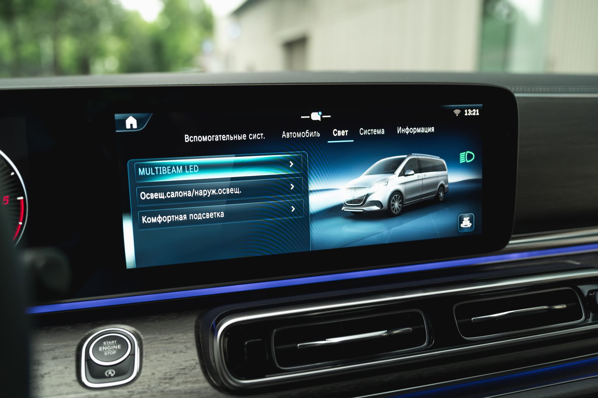 Премиальная аудиосистема Burmester создаёт качественное, объёмное звучание в салоне. Музыка будет одинаково комфортно восприниматься и на первом ряду, и на задних креслах — важно для тех, кто использует V-Класс как мобильный офис или семейный автомобиль.
