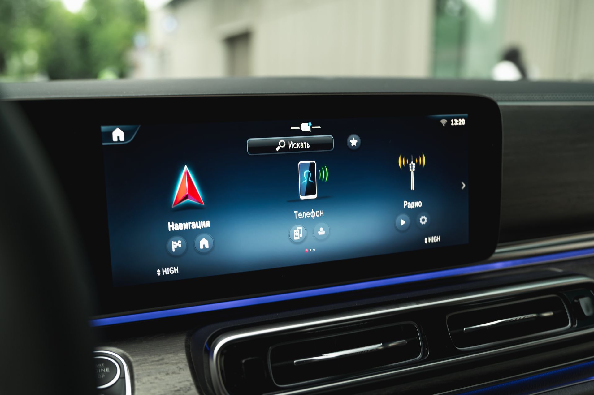 Современная мультимедийная система MBUX обеспечивает навигацию, доступ к медиаконтенту и удобное управление функциями автомобиля через сенсорный экран, голосовые команды и сенсорные панели на руле.